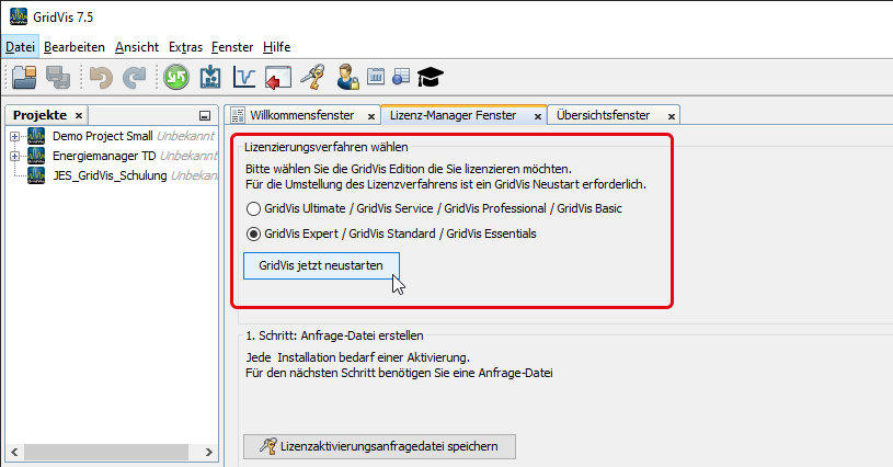| Gültige alte Lizenz vorhanden | GridVis Desktop startet mit dem bisherigen Lizenz-Modell | Die GridVis erkennt automatisch, dass eine alte Lizenz vorhanden ist und startet im entsprechenden Modus |