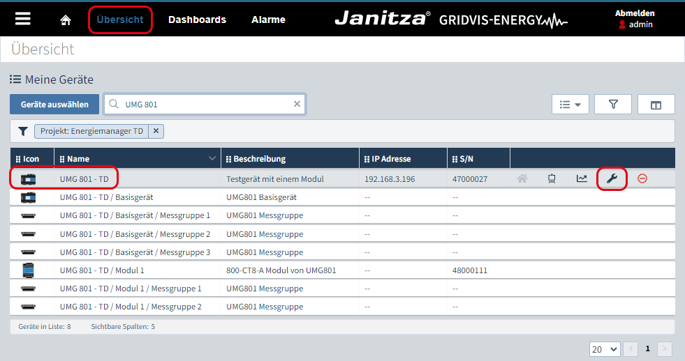 Legen Sie ein neues Gerät in der GridVis-Desktop an. Wählen Sie → UMG 801