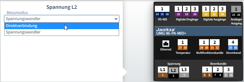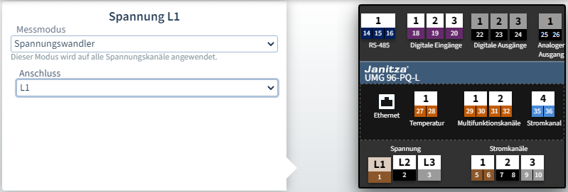 - Klicken Sie im Gerätebild auf einen Spannungsanschluss L1-L3.