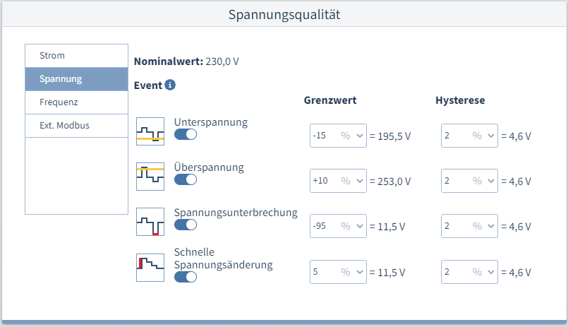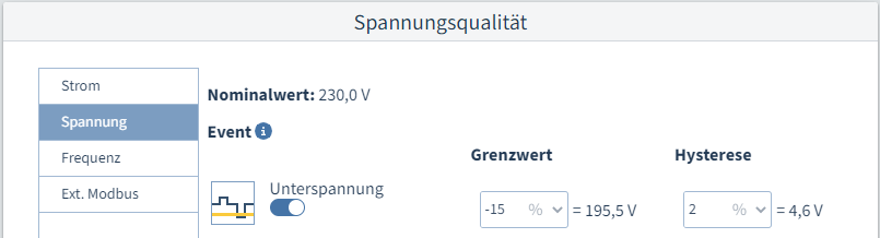 Legen Sie hier die Grenzwerte der Spannungsqualität fest. Wenn diese Grenzwerte über- bzw. unterschritten werden, wertet das Messgerät dies als Ereignis (Event) und startet eine Aufzeichnung einschließlich 20 s Vorlauf- und 20 s Nachlaufzeit vor und nach dem Triggerzeitpunkt.