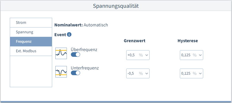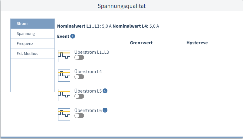 Wenn bei Überstrom eine Ereignis-Aufzeichnung gestartet werden soll, aktivieren Sie den Schiebeschalter und definieren Sie Grenzwert und Hysterese.