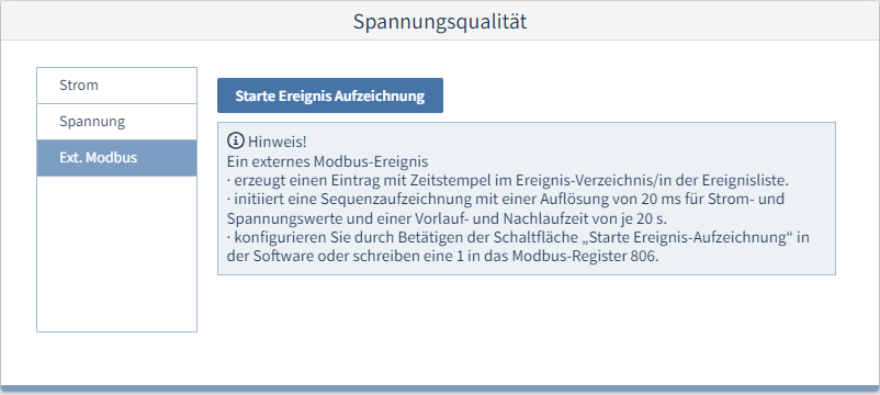 Durch Drücken dieser Schaltfläche können Sie manuell eine Ereignis-Aufzeichnung starten. Über Modbus RTU wird ein entsprechendes Signal an das Messgerät gesendet.