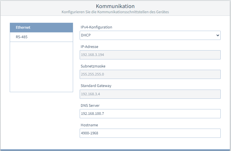 - DHCP: Dem Messgerät wird beim Starten eine IP-Adresse automatisch zugewiesen. Die nachfolgenden Felder werden automatisch mit den zugewiesenen Werten befüllt und sind ausgegraut.