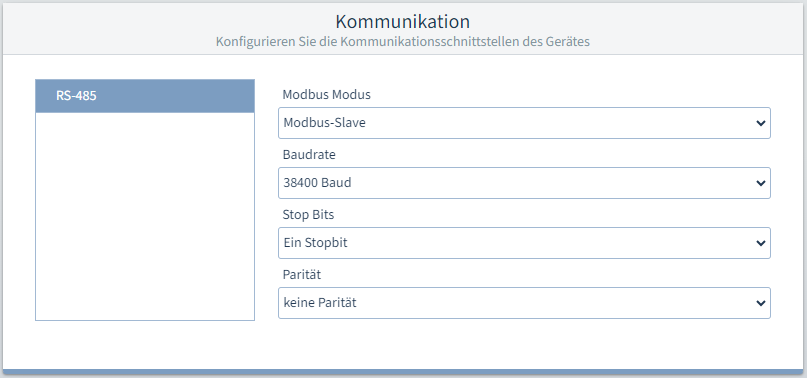 Klicken Sie auf RS-485, um die Einstellungen anzuzeigen. Über die RS-485-Schnittstelle kann das Messgerät über das Protokoll "Modbus RTU" kommunizieren.