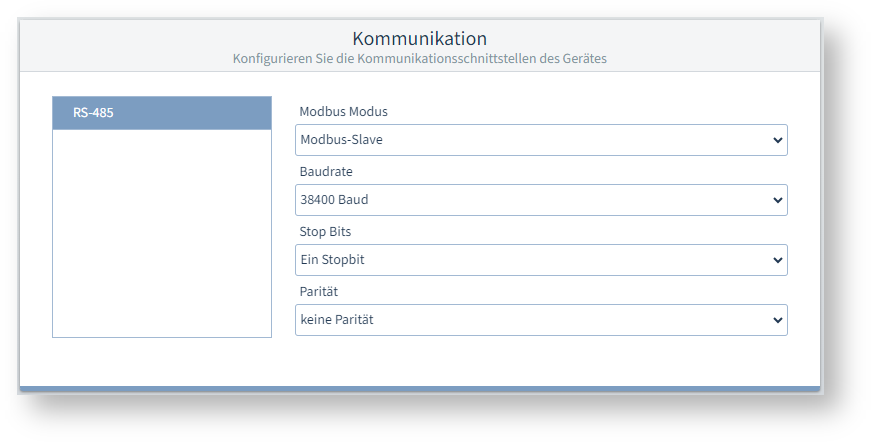 Über die RS-485-Schnittstelle kann das Messgerät über das Protokoll "Modbus RTU" kommunizieren.