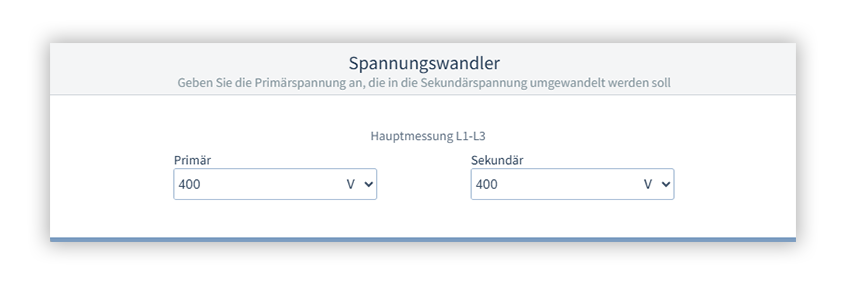 2. Tragen Sie die Primär- und Sekundärspannung gemäß den technischen Daten des Spannungswandlers ein. Dieser stellt das Umrechnungs- bzw. Wicklungsverhältnis des Spannungswandlers dar.