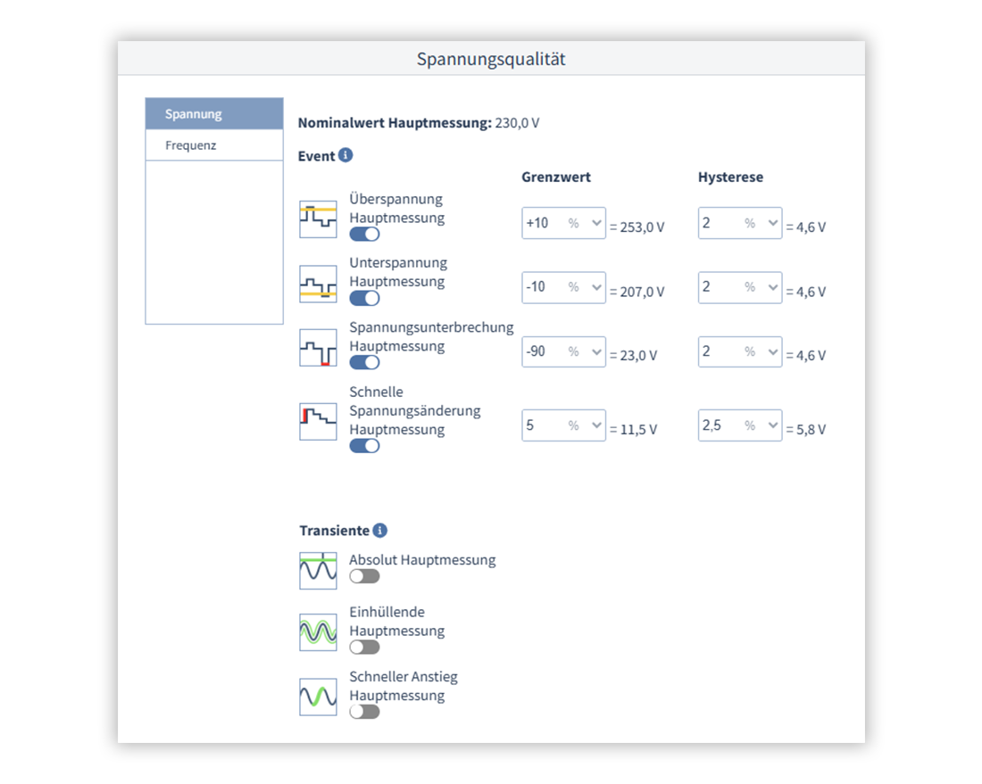 Legen Sie hier die Grenzwerte für die Spannungsqualität fest. Wird einer dieser Werte über- oder unterschritten, erkennt das Gerät dies als Ereignis (Event) und startet automatisch eine Aufzeichnung – einschließlich 20 s vor und nach dem Ereignis.